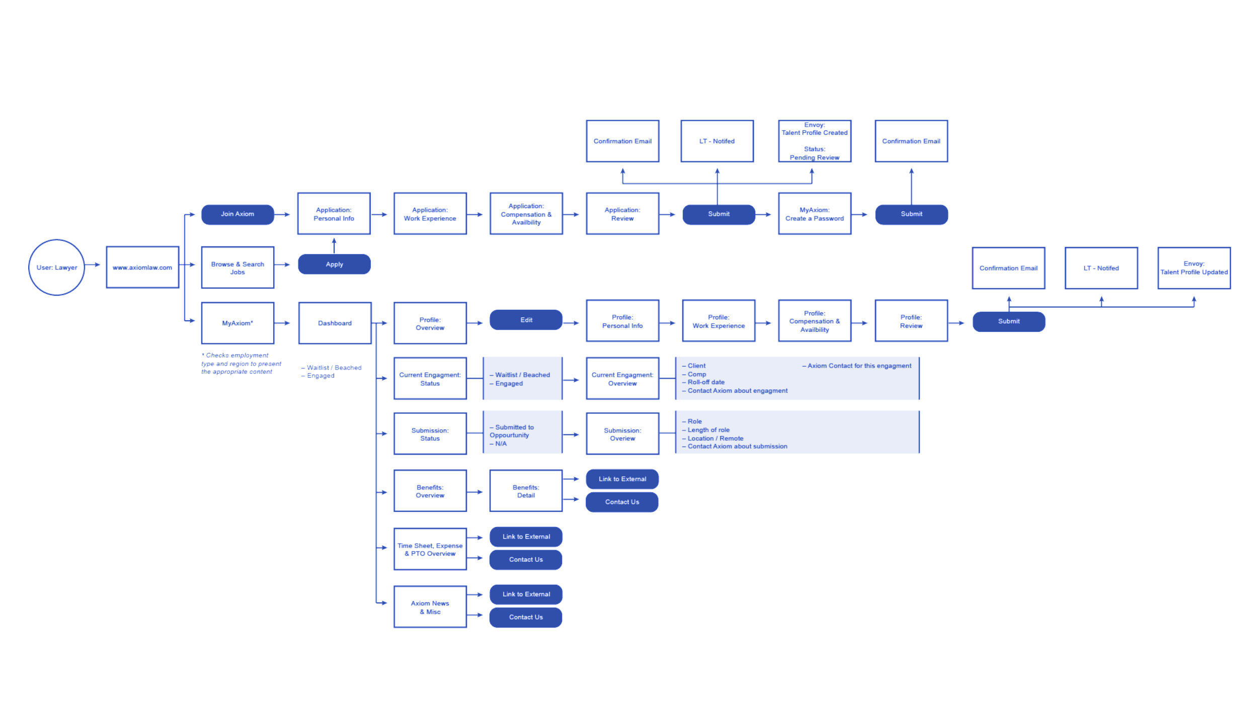 Used by internal Axiom employees to match lawyers with sales opportunities and manage their Axiom careers. This application shares information with and simplifies workflows across integrated systems.